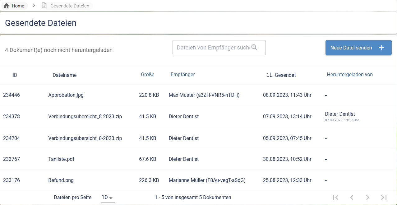 Der Ausgang der Dokumentenverwaltung beinhaltet alle selbst versendeten und erzeugten Dateien. Nachdem ein eigener Dokumentenschlüssel erzeugt wurde, können Dateien versendet werden. Bis zu ihrer Löschung sind sie in der Übersicht aufgelistet. Die Übersicht bietet darüber hinaus eine Suche, sowie die Möglichkeit, eine neue Datei zu versenden.
