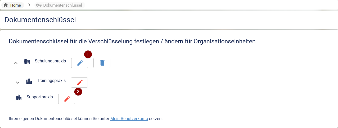 In dieser Übersicht werden die DS der Organisation verwaltet. Ist für eine Organisationseinheit noch kein Schlüssel generiert, so ist das Stift-Icon rot eingefärbt (2). Mit Klick des Icons kann ein DS gesetzt werden. Existiert bereits ein DS für die Organisationseinheit, so ist das Stift-Icon (1) blau und es gibt über das Mülleimer-Icon zum Löschen des DS.
