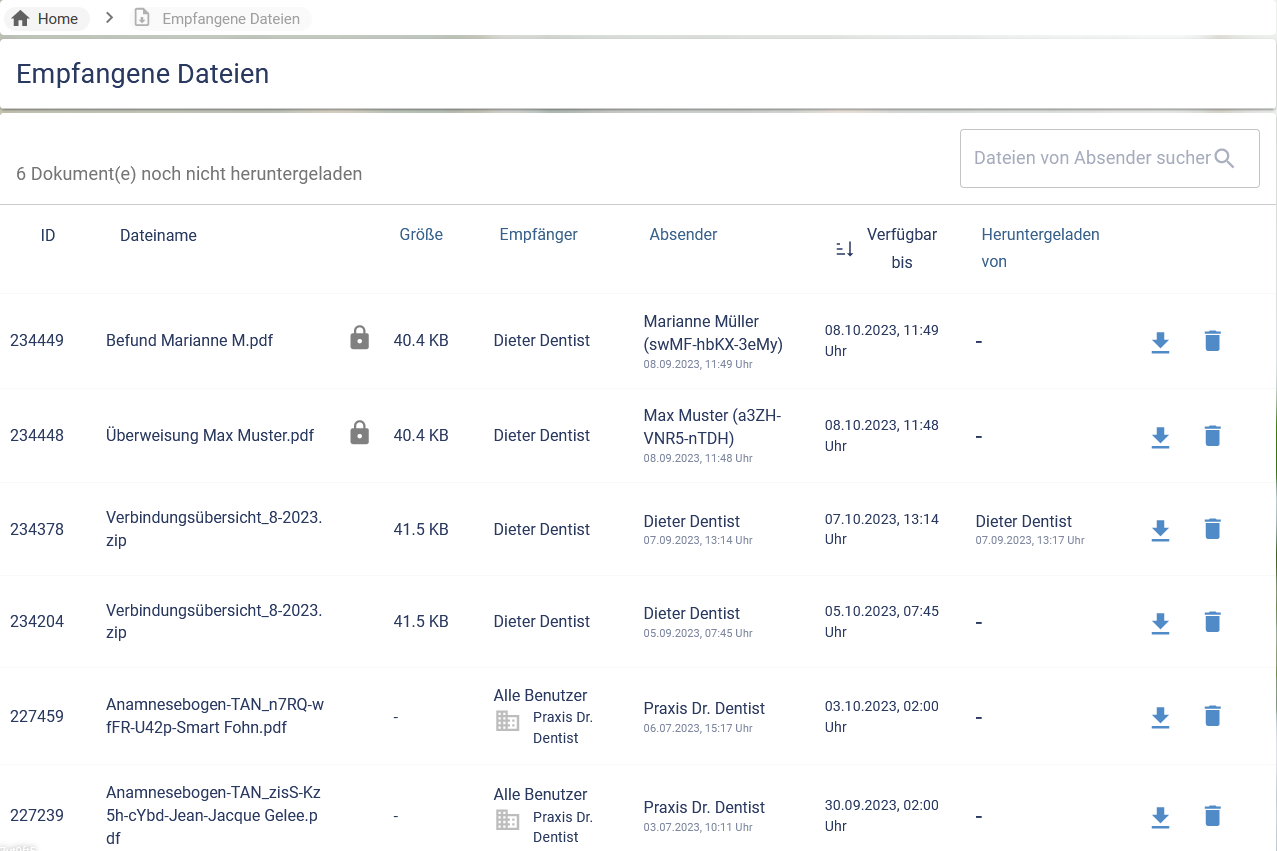 Im Eingang der Dokumentenverwaltung befinden sich alle Dokumente, die Sie als Benutzer der Anwendung empfangen haben. Dabei befinden sich hier nicht nur Dokumente, die von anderen Personen explizit an Sie verschickt wurden, sondern auch automatisch erzeugte Dokumente, wie die Verbindungsübersicht und Anamnesebögen (bei Nutzung des Termingenerators).