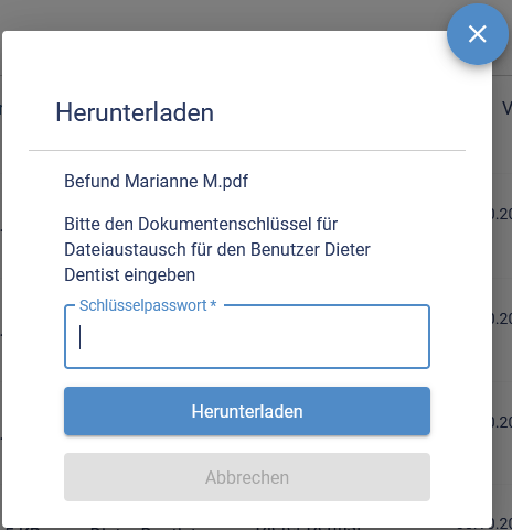 Verschlüsselte Dokumente sind Dokumente, die explizit an Sie verschickt wurden. Sie sind mit einem Schloss gekennzeichnet. Um sie herunterzuladen, wird der persönliche Dokumentenschlüssel benötigt.
