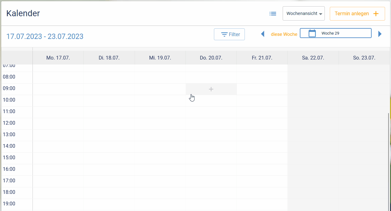 Derselbe Dialog wird auch durch Auswahl eines Zeitfensters über den Termin direkt im Kalender über das + Icon (8) geöffnet. In diesem Fall ist das Datum und die Uhrzeit bereits vorbelegt.