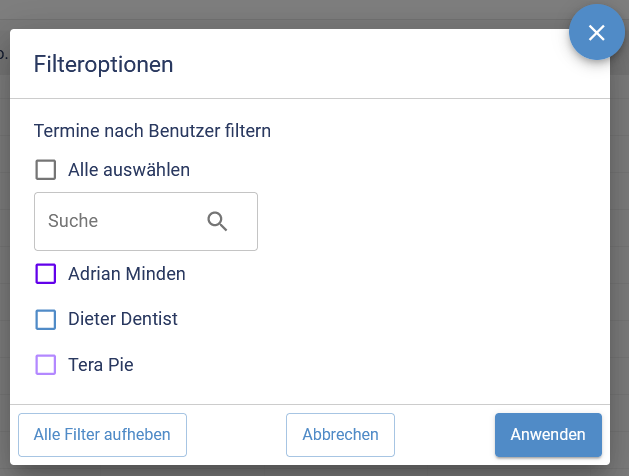 Über den Filter (5) lassen sich Termine anderer Personen ein- oder ausblenden. Dabei lassen die Personen sich einzeln zu- oder abwählen. Das Suchfeld unterstützt beim Auffinden der richtigen Person.