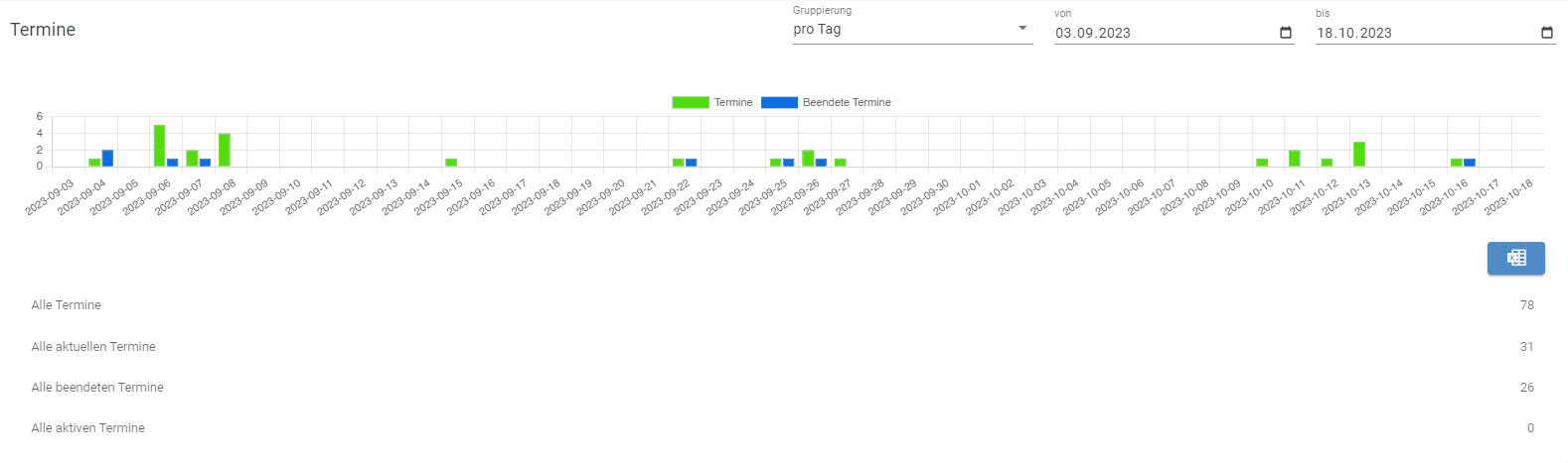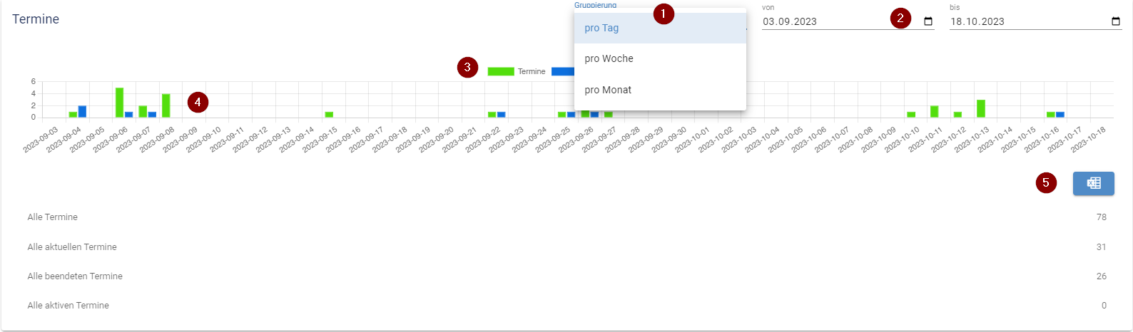 An der Beispielstatistik Termine sind die Funktionen erklärt. Für jede Statistik gelten die gleichen Funktionen: