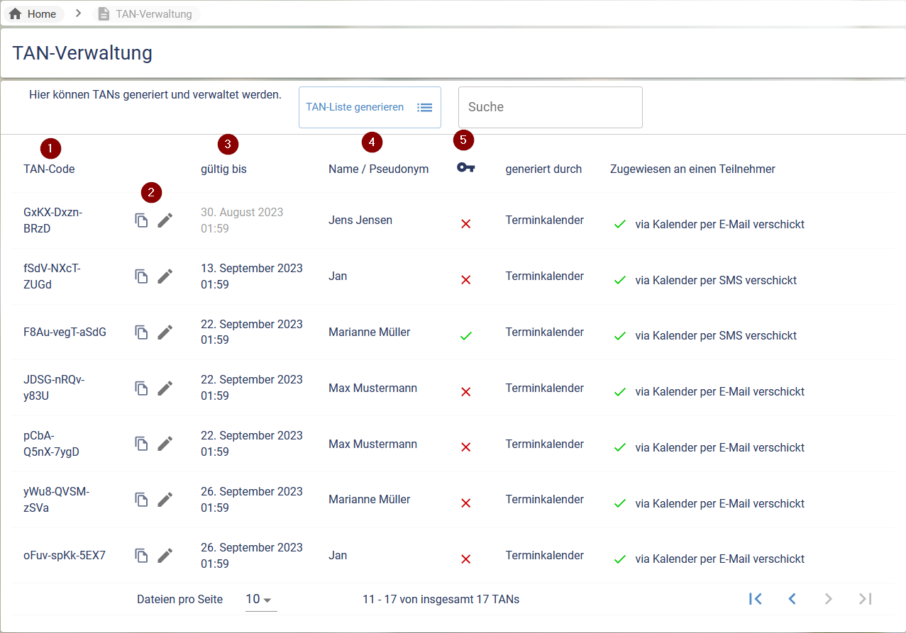 Die TAN-Verwaltung dient zur Übersicht aller gültigen TANs und bietet die Möglichkeit, die TANs zu kopieren und die dazugehörigen Personen einzusehen sowie die Gültigkeit anzupassen.