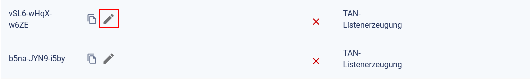 Kopieren oder bearbeiten des Eintrags. Hier kann die Gültigkeit der TAN sowie das Pseudonym der dazugehörigen Person geändert werden. Die TAN selbst kann nicht geändert werden.