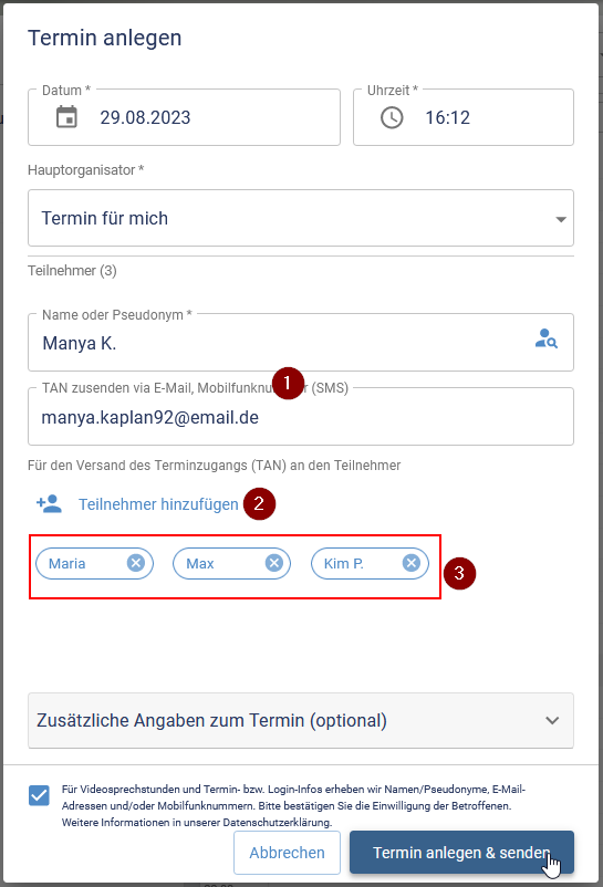 Für Gruppengespräche wird ein normaler Termin angelegt und die Teilnehmenden nacheinander zu diesem hinzugefügt. Für jede Person wird die Kombination aus Name & E-Mail/Mobilfunk-Telefonnummer (1) eingegeben und mit Teilnehmer hinzufügen (2) bestätigt. Alle hinzugefügten Einträge werden dargestellt und können auch wieder entfernt werden (3).