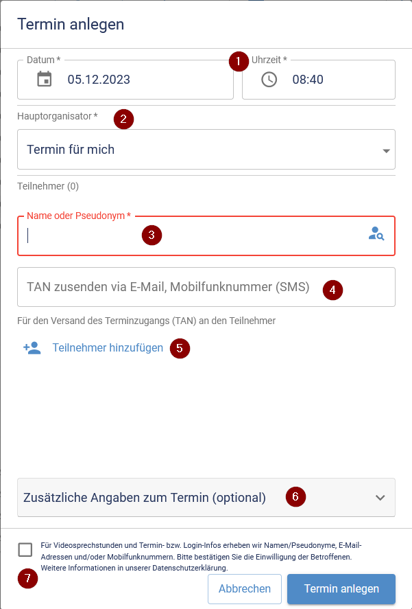 Teilnehmer hinzufügen (optional): Diese Option wird gewählt, wenn weitere Teilnehmende hinzugefügt werden sollen. Die eingegebenen Daten werden gespeichert und die Eingabefelder unter 3) und 4) sind wieder leer. Es können bis zu 4 Teilnehmende angelegt werden (siehe Gruppengespräche).