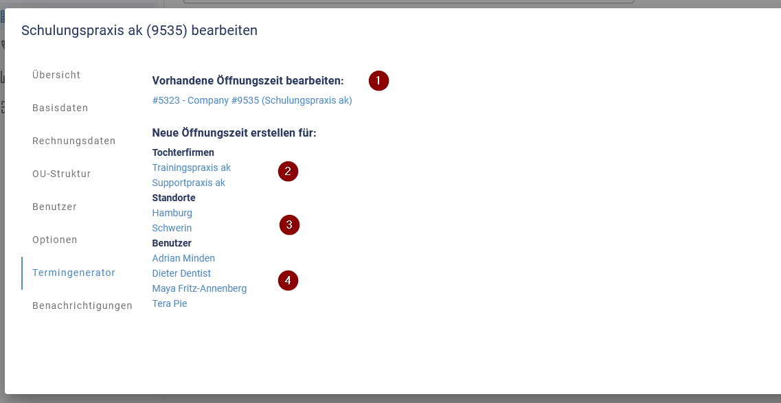 Im Adminbereich der Anwendung navigieren Sie auf Firmen und wählen im folgenden Dialog Ihre Firma aus. Es wird ein Popup-Fenster erscheinen. In diesem rufen Sie die Option Termingenerator auf.