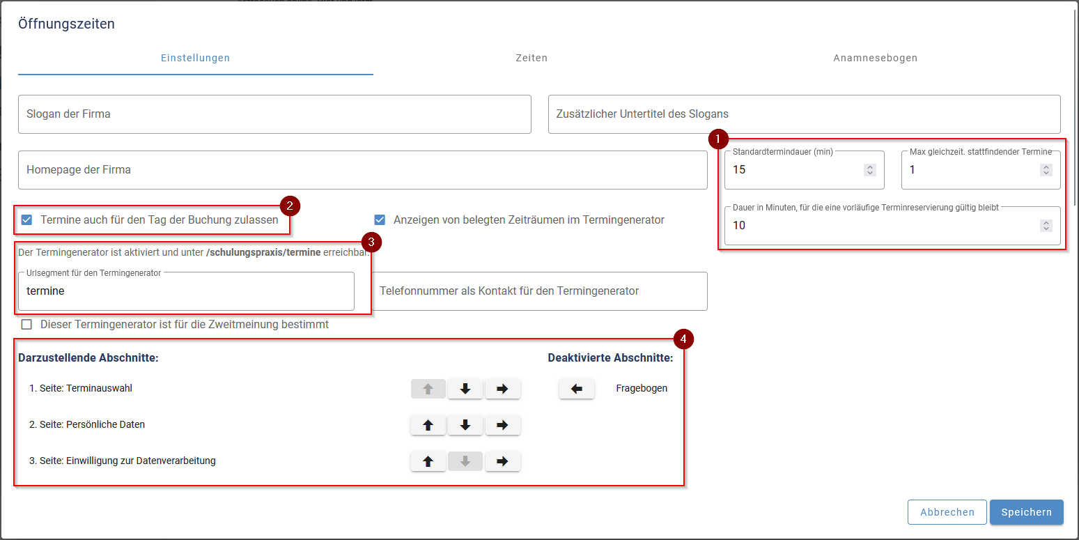 Das Öffnungszeiten-Paket enthält die Reiter Einstellungen, Zeiten und Anamnesebogen (Fragebogen). In den Einstellungen werden die wichtigsten Grundeinstellungen für diese Öffnungszeiten definiert. Im ersten Schritt werden die Erreichbarkeit der Terminseite und Grundeinstellungen festgelegt: