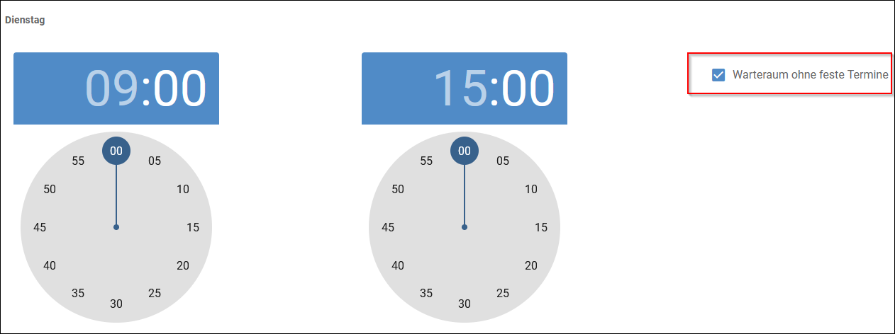 Werden statt fester Termine digitale Sprechstunden wie in einem Wartezimmer angeboten, so wandelt die Option Warteraum ohne feste Termine diesen Zeitraum zu einem freien Zeitfenster um. In diesem können sich Terminsuchende ohne feste Uhrzeit in das virtuelle Wartezimmer setzen, von wo sie dann in die Videosprechstunde aufgerufen werden.