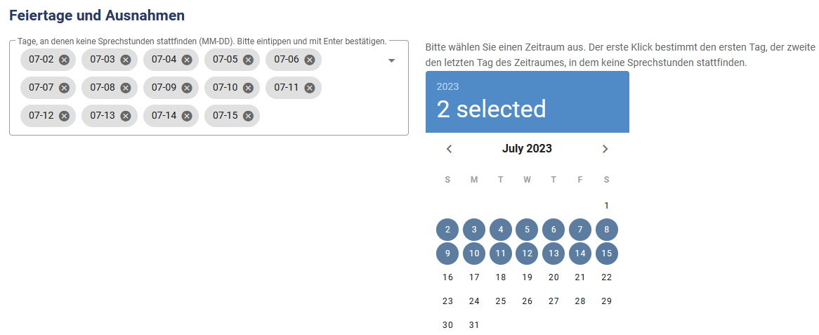 Für Urlaubszeit und Feiertage lassen sich beliebig viele Tage am Ende des Dialogs im Reiter Zeiten festlegen. Mit dem Datepicker werden Zeiträume und einzelne Tage gewählt, an denen die oben festgelegten Zeiträume nicht greifen und keine Termine zur Auswahl stehen.