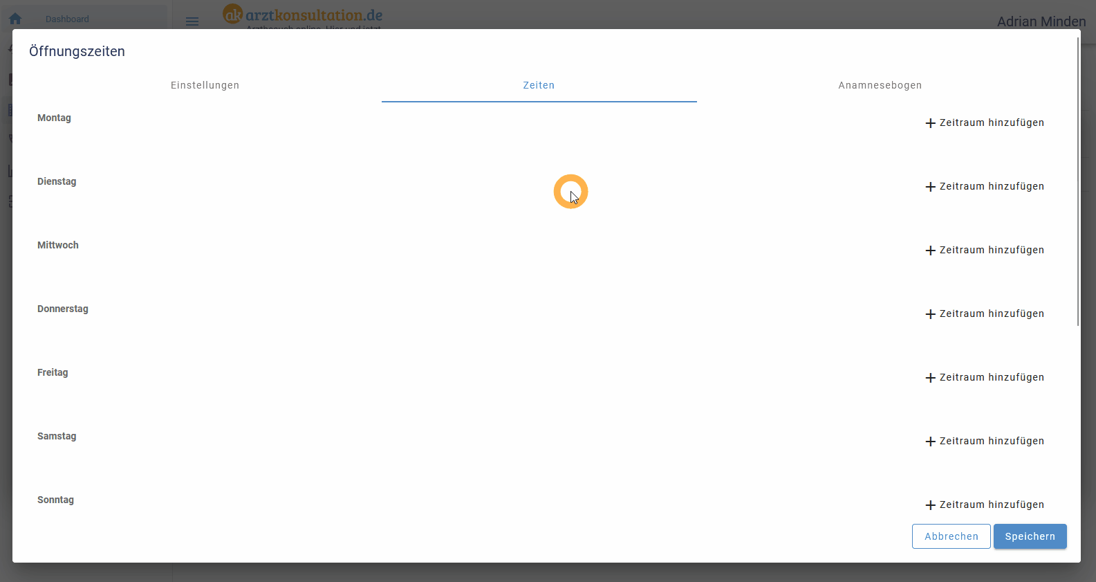 Es lassen sich für jeden Wochentag beliebig viele Zeiträume definieren, in denen Termine gebucht werden können. Der Abstand zwischen zwei möglichen Terminen wird im Reiter Einstellungen über die Standardtermindauer festgelegt.