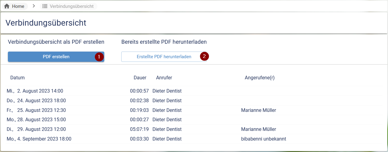 Die Verbindungsübersicht bietet die Grundlage zur Abrechnung von durchgeführten Videosprechstunden und gleichzeitig als kleine Statistik. Auf der Übersichtsseite werden die durchgeführten Gespräche chronologisch aufgereiht.