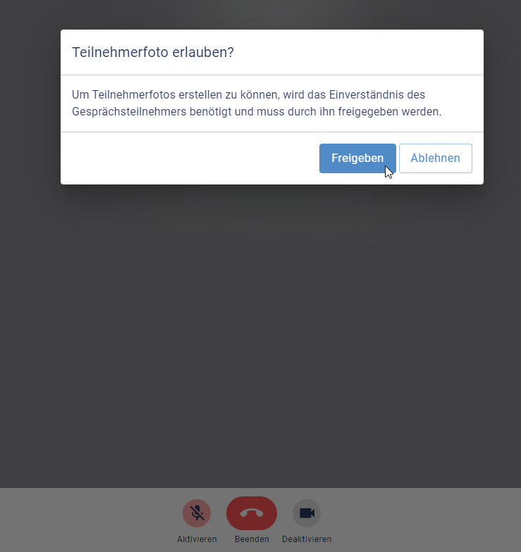 Während der Videosprechstunde kann es notwendig sein, dass ein Foto von der behandelten Person aufgenommen wird. Hierfür bietet die Anwendung die Funktion Teilnehmerfoto. Um Missbrauch zu verhindern, kann diese Funktion nur nach Bestätigung der teilnehmenden Person durchgeführt werden.