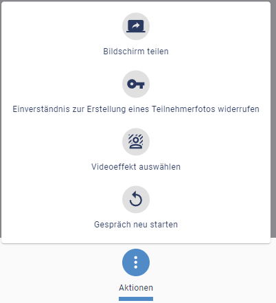 Das Einverständnis für die Funktion Teilnehmerfoto kann über den Hinweis am oberen Bildschirmrand oder über die Funktion Aktionen >> Einverständnis zur Erstellung eines Teilnehmerfotos widerrufen zurückgezogen werden.